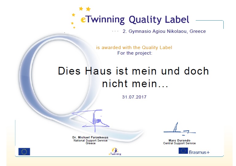 To σχολείο μας βραβεύτηκε με την ετικέτα ποιότητας από την Εθνική Μονάδα eTwinning για το έργο: Dies Haus ist mein und doch nicht mein...
